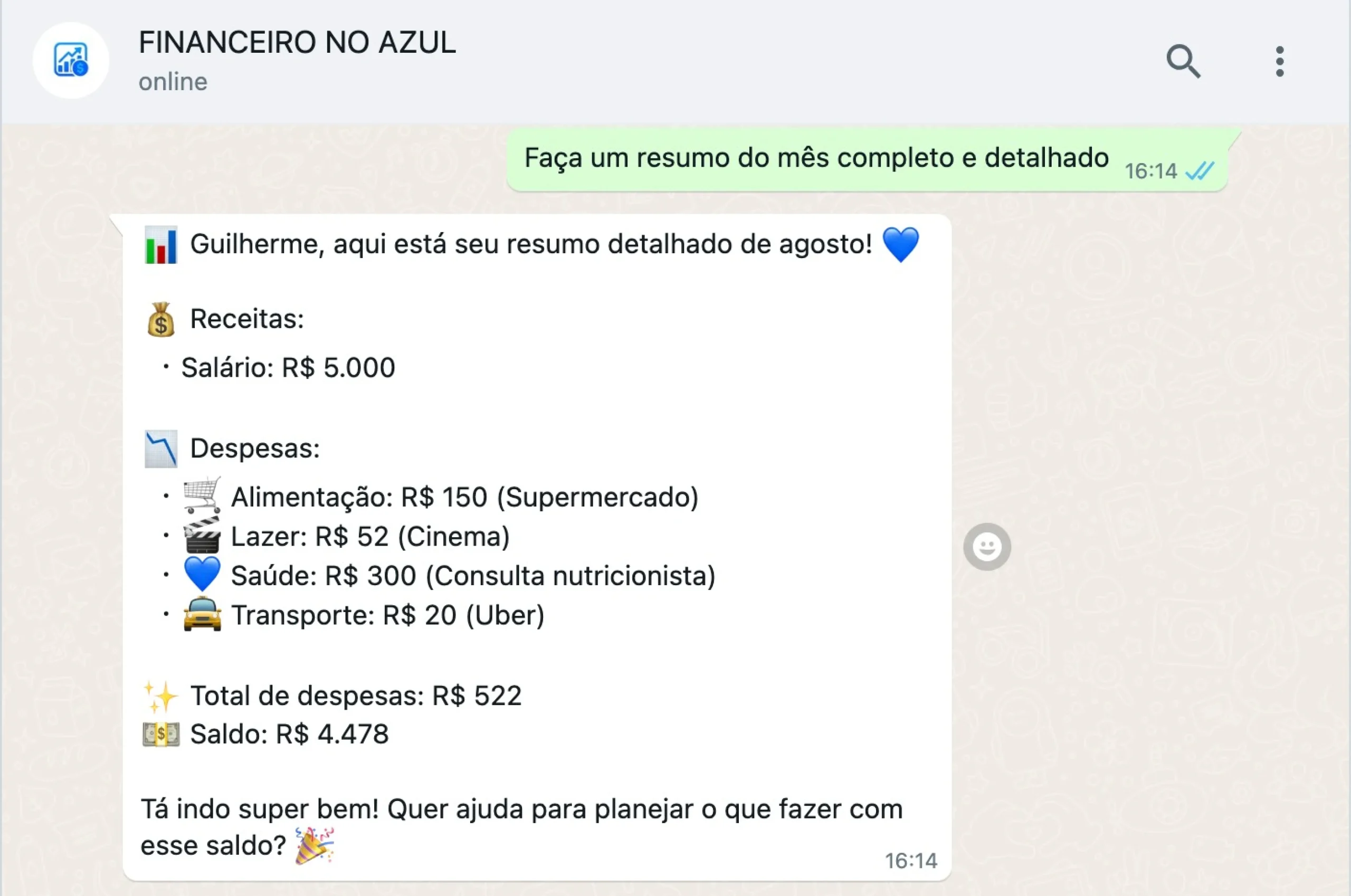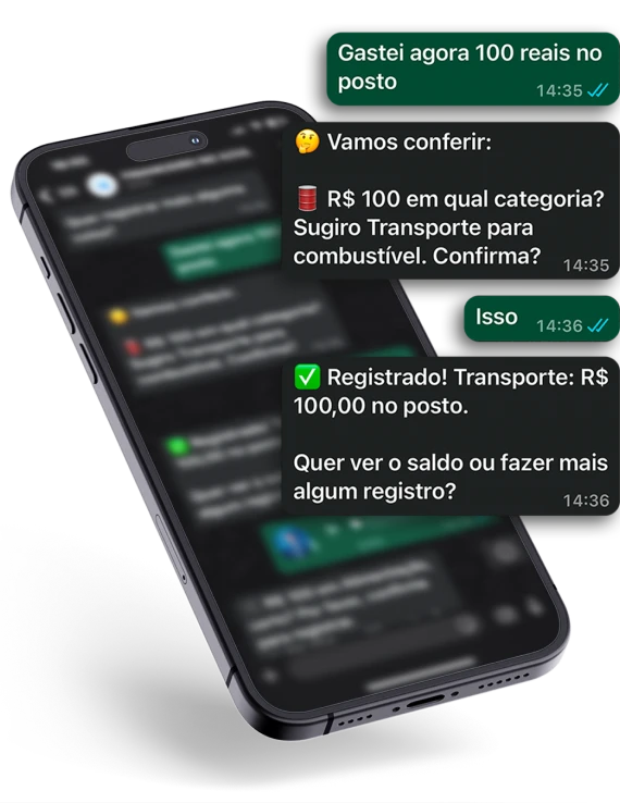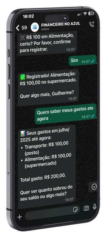 Basta dizer "gastei 60 no mercado" e seu assistente registra, organiza e mostra tudo em gráficos simples.