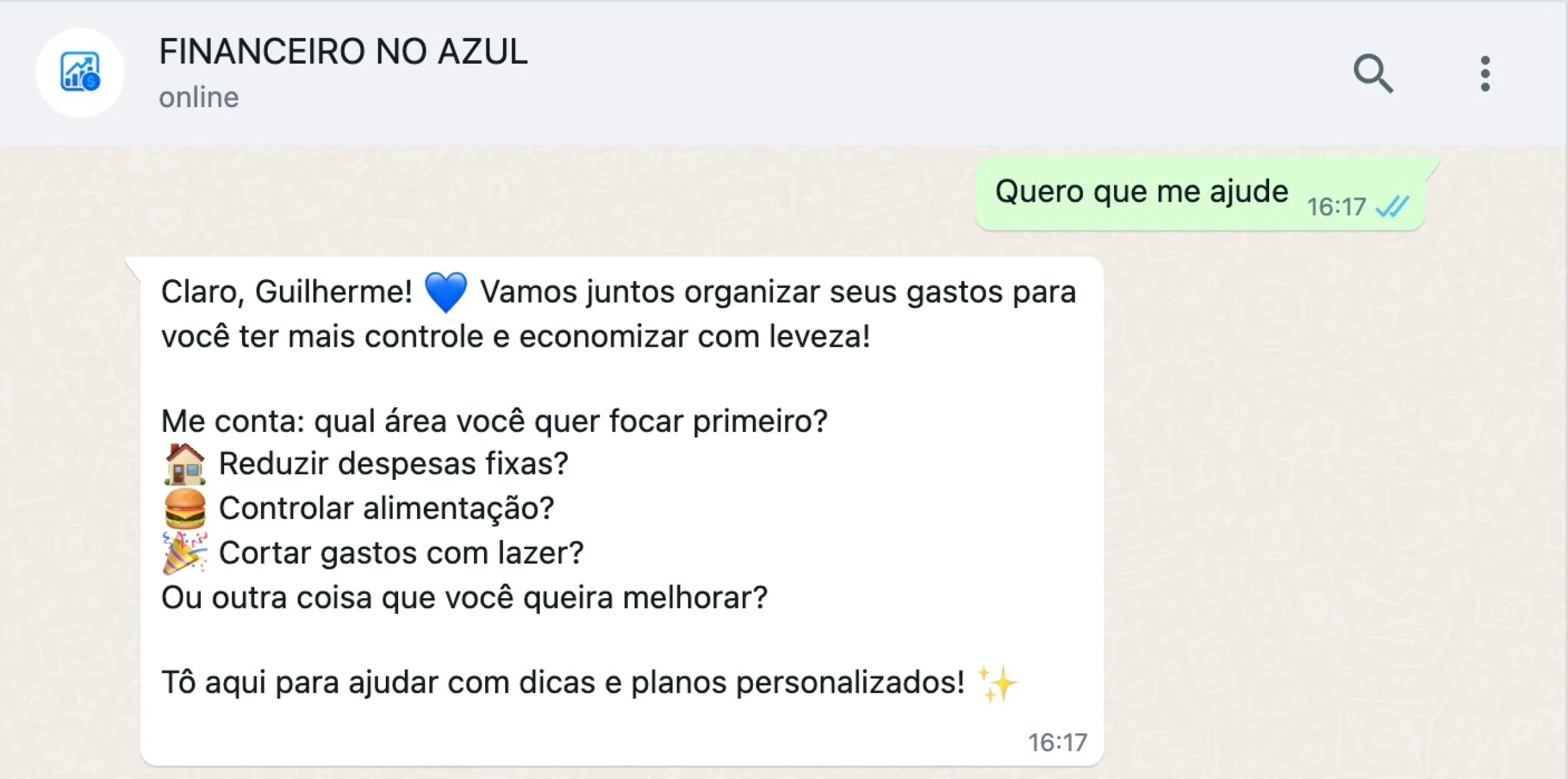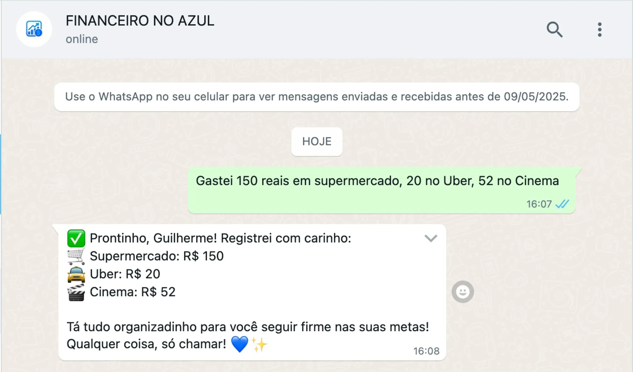 Uma inteligência artificial que funciona direto no seu WhatsApp, pronta para te ajudar a organizar compromissos, controlar gastos e ganhar tempo — tudo por mensagem, sem baixar nenhum app novo ou mexer em planilhas complicadas.